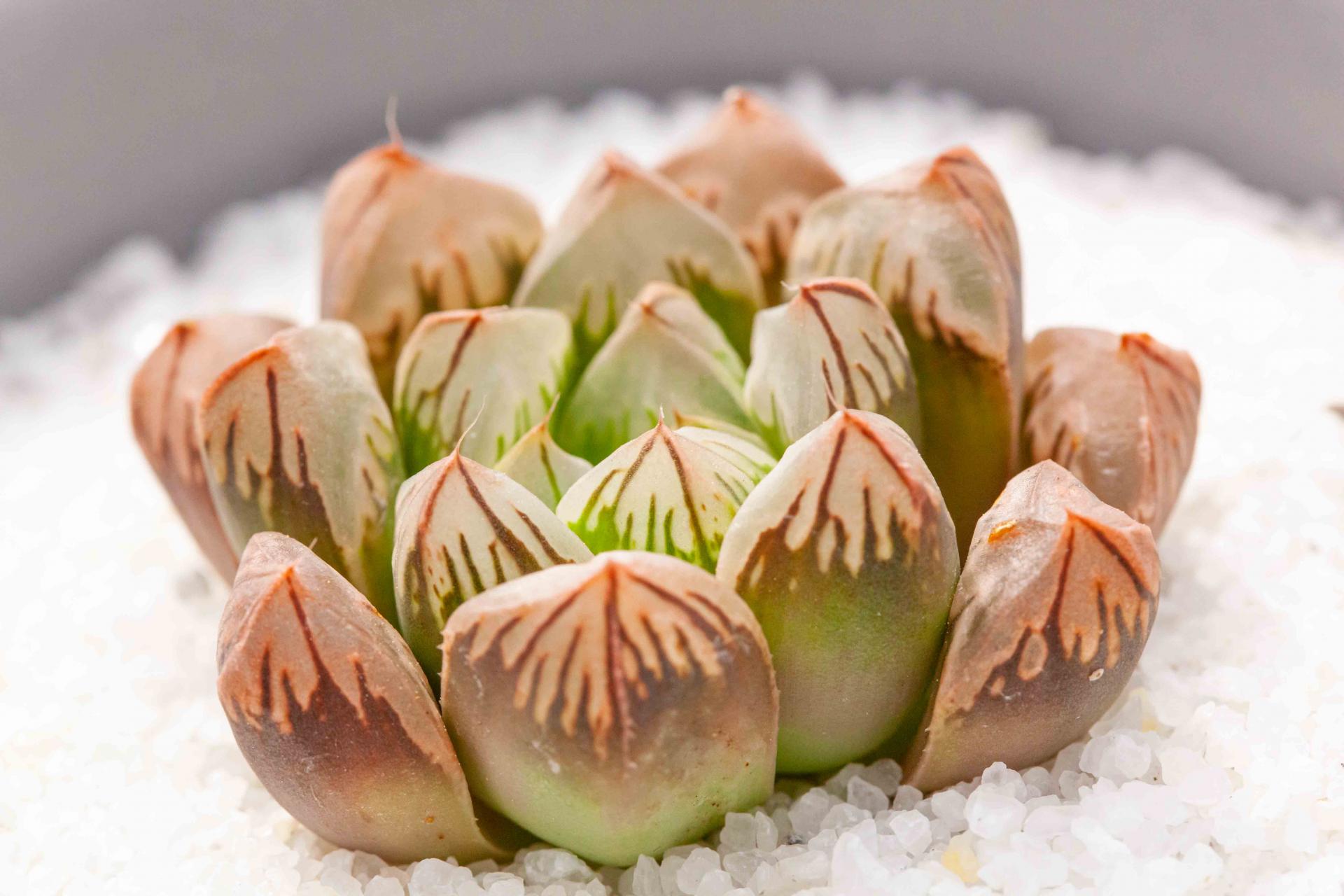 이름처럼 하월시아계 옵투사의 새로운 타입입니다. 복숭아처럼 아름답게 단풍이 들고, 투명한 창 속 하얀 백운이 특징.
